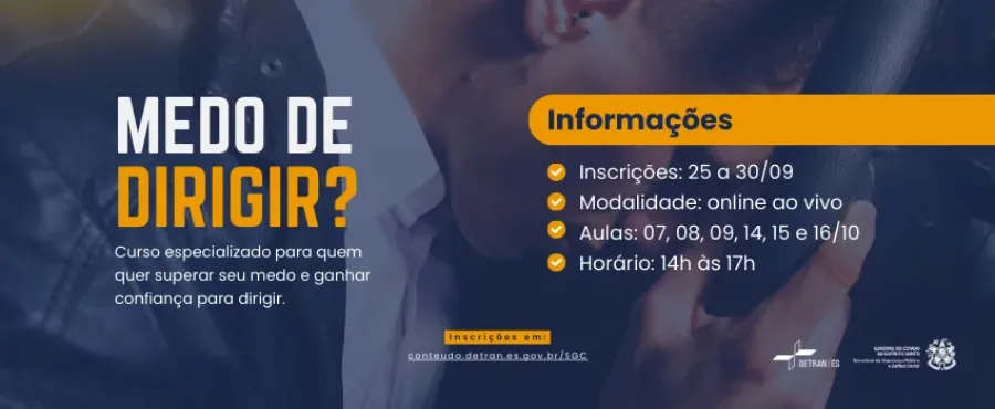 O curso é gratuito e será realizado pela Escola Pública de Trânsito (EPT) em seis módulos às terças, quartas e quintas-feiras, entre os dias 07 a 16 de outubro, das 14h às 17h. As aulas serão no formato Ensino a Distância (EaD), ao vivo, e poderão ser feitas por pessoas de todo o Estado, habilitadas ou não, e que tenham interesse em superar seu medo de dirigir ou até mesmo de dar início ao processo de habilitação.