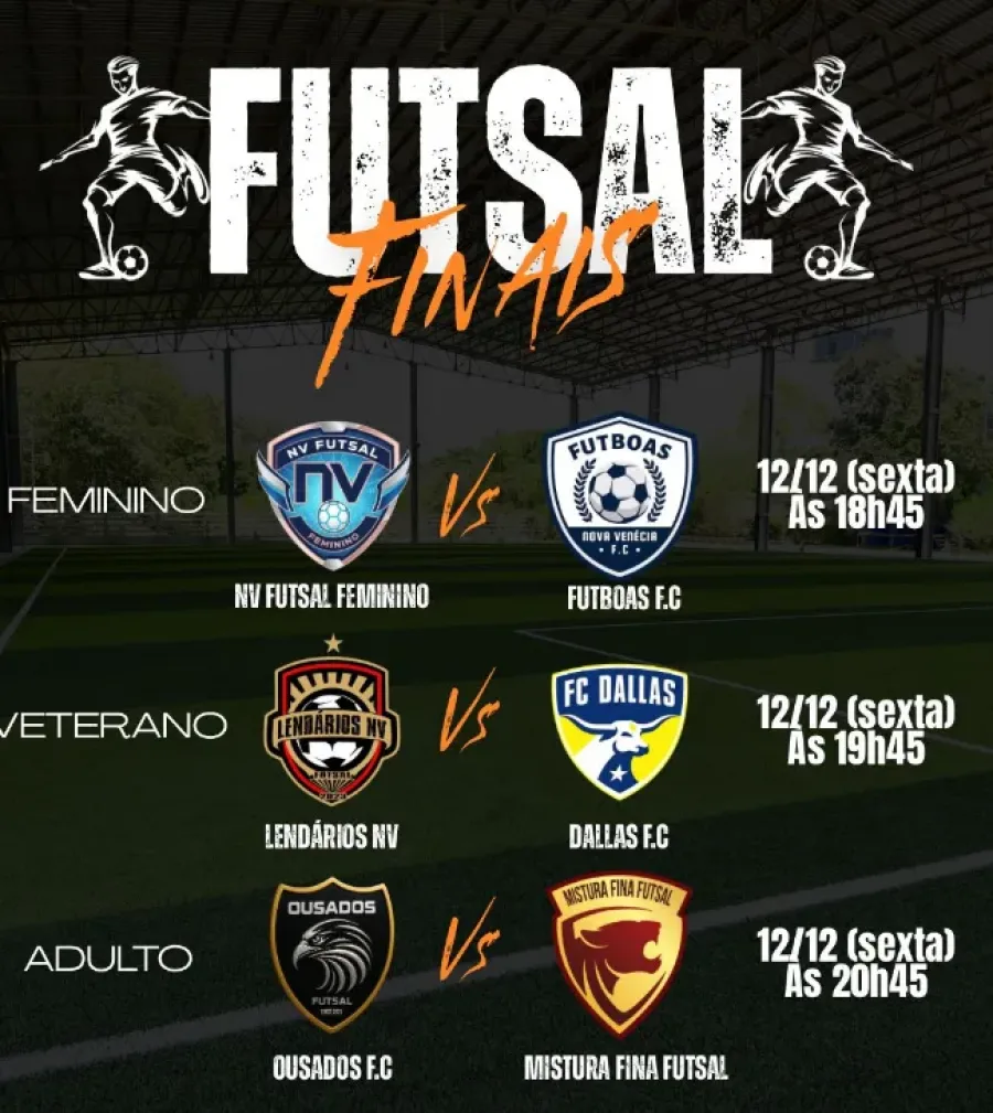 A programação reúne equipes que avançaram após meses de disputas e que agora buscam o título em três categorias. O primeiro confronto da noite será às 18h45, com a final do futsal feminino adulto entre NV Futsal Feminino e Futboas FC. Na sequência, às 19h45, Lendários NV e Dallas FC decidem a categoria masculina veterana. O último duelo está marcado para 20h45, com Ousados FC e Mistura Fina Futsal pelo masculino adulto.
