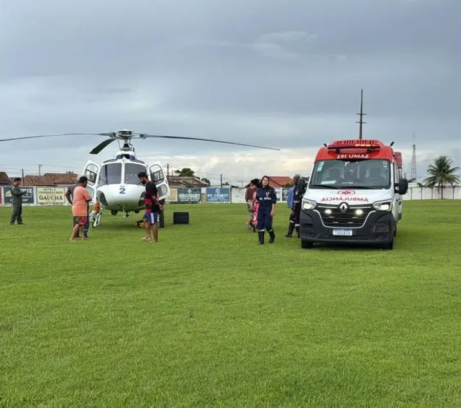 O helicóptero do NOTAER pousou na área externa do Ginásio de Esportes Osman Santana Moura, garantindo agilidade na transferência do paciente para uma unidade de referência, o Hospital Rio Doce, em Linhares.