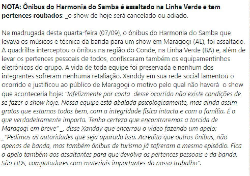 “Acredito que outros ônibus, não apenas de banda, mas também ônibus de turismo já sofreram o mesmo episódio. Fica o apelo também aos assaltantes para que devolva os pertences pessoais e da banda. São HDs, computadores com materiais importantes do nosso trabalho”.