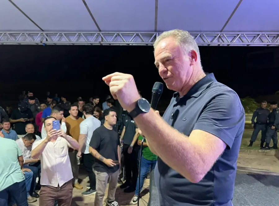 Na Praça Angelina Espanhol Covre, o governador participa da solenidade de assinatura de convênio para pavimentação em blocos de concreto, execução de calçadas e implantação de rede de esgoto nas avenidas Brasil e Portugal, além das ruas Itália, Uruguai, Maria de Souza Livramento e Joaquim Antônio Rocha, no Polo Industrial do município.
